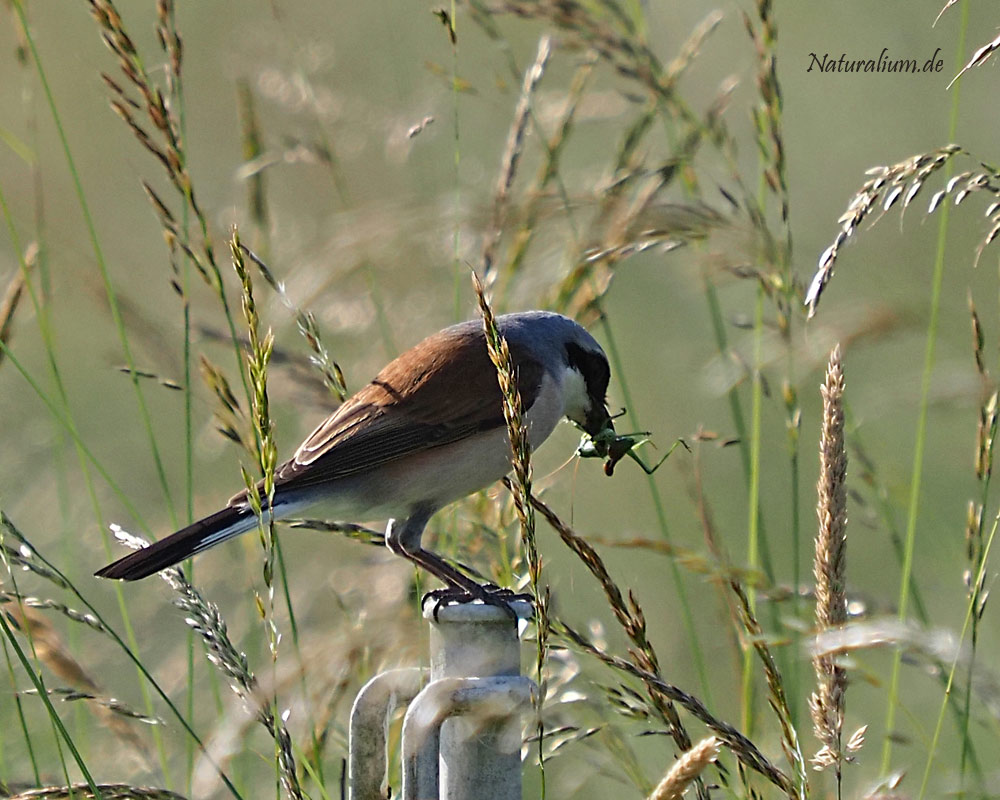 Neuntöter (Männchen) mit erbeuteter Heuschrecke