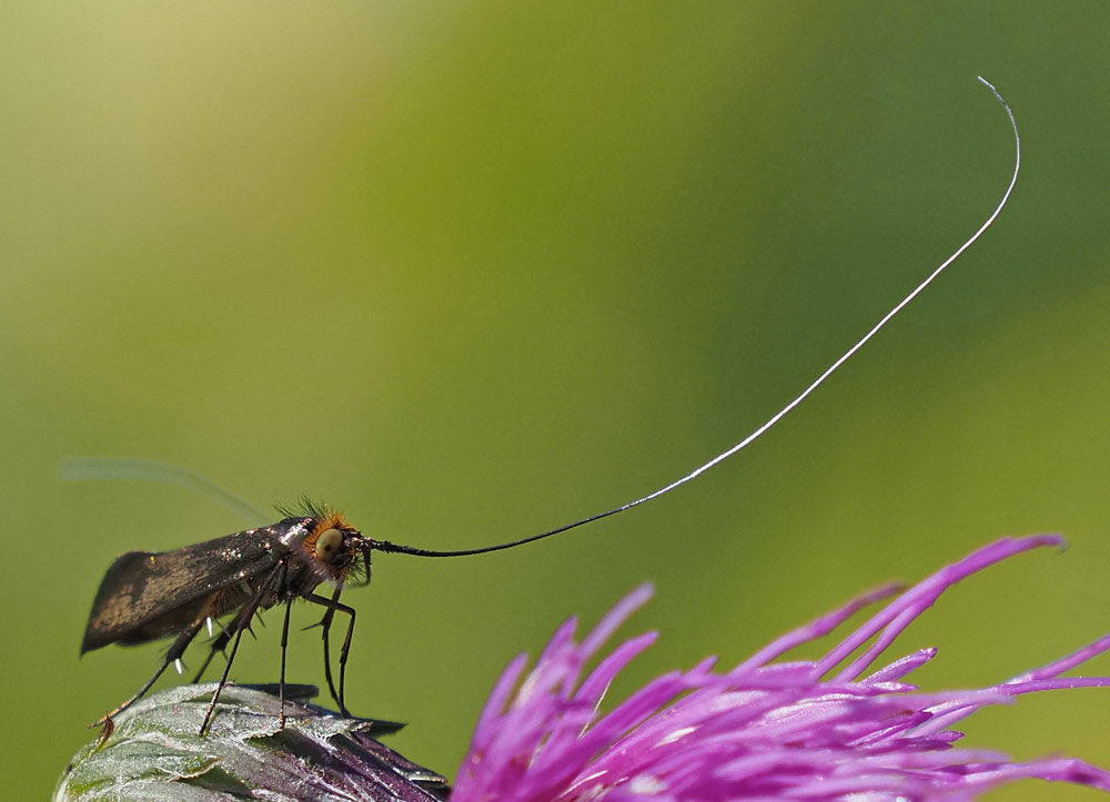 Kleinschmetterlinge aus der Familie der Adelidae zeichnen sich durch ausgeprochen lange Fühler aus. Dazu gehört z.B. die Skabiosen-Langhornmotte (Nemophora metallica) auf dem Bild oder Falter aus dem Artenkomplex der De Geers-Langfühler (Nemophora degeerella/scopolii/deceptoriella).